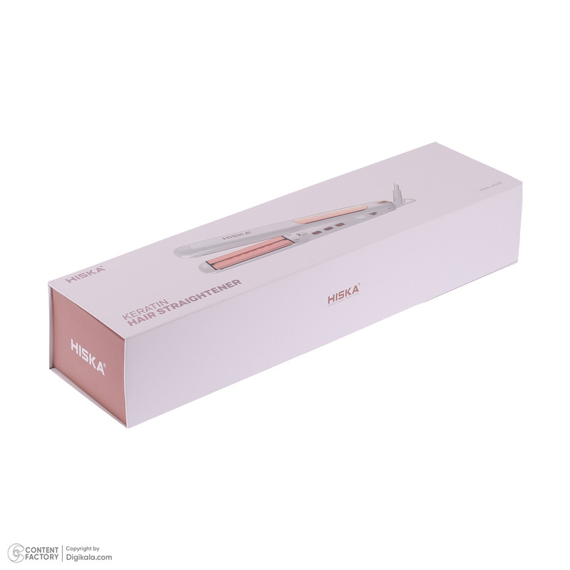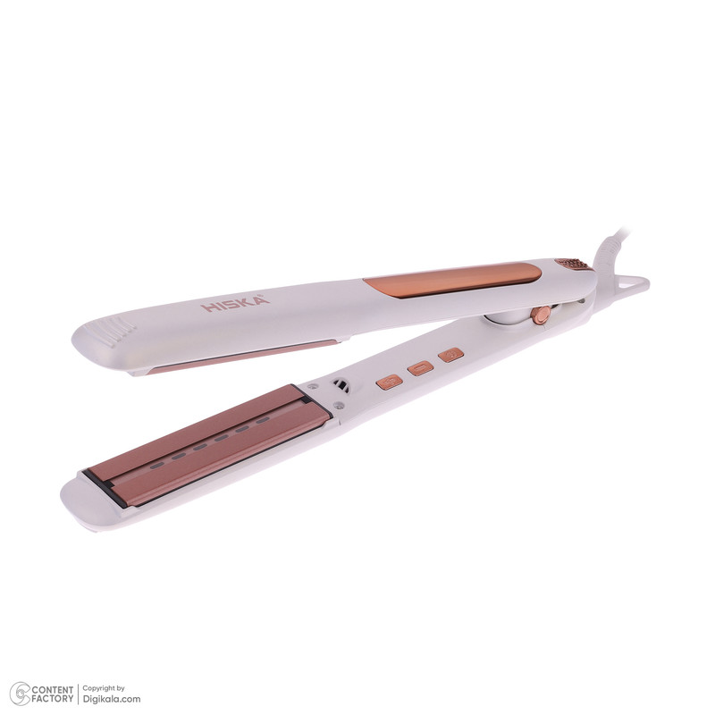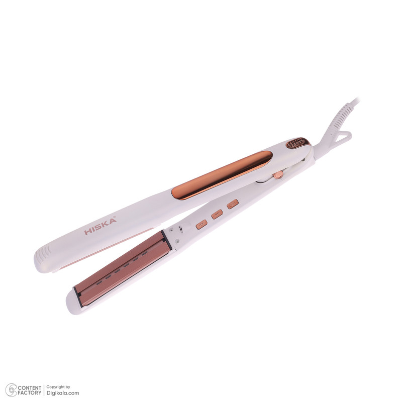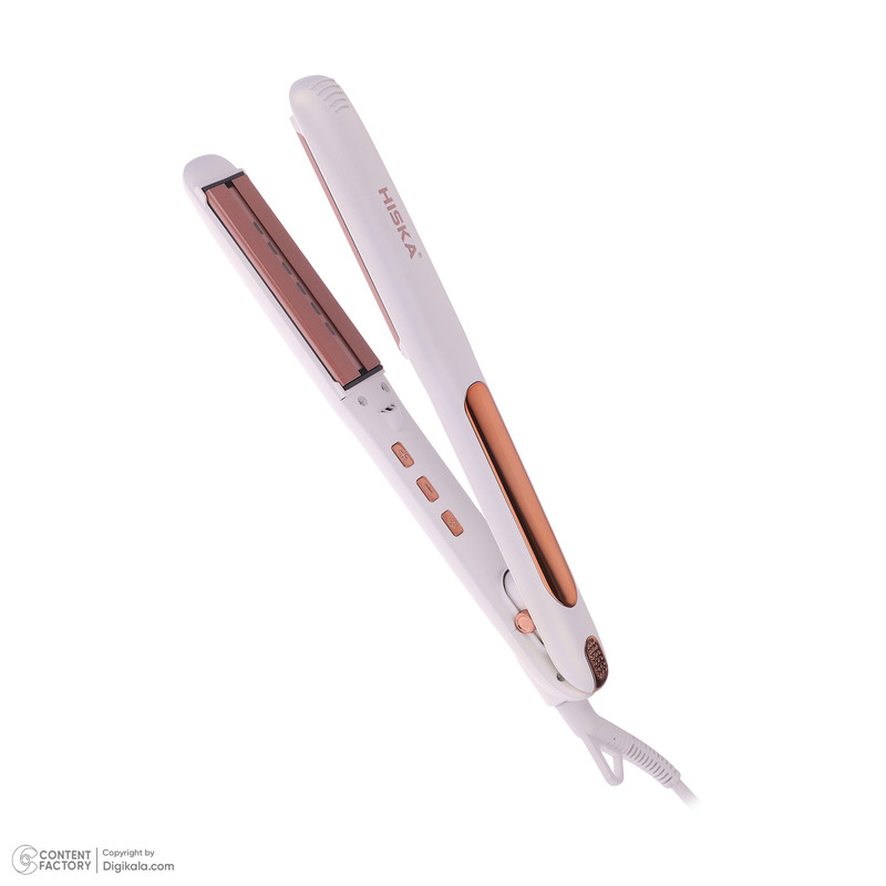 اتوی موی سر برند هیسکا یک محصول مناسب برای حالت دادن به موها در کمترین زمان ممکن با توجه به محدود کردن حرارت تولید شده برای جلوگیری از آسیب به ساقه مو می باشد. اتو صاف کننده موی سر هیسکا مدل H5106 ابزاری قابل اعتماد و مقرون به صرفه است که برای استفاده آسان و سریع طراحی و ساخته شده و به واسطه ابعاد مناسب در سفر نیز قابل حمل است. بدنه این محصول با رنگ سفید پوشانده شده و در قسمت رویی که LCD نشان دهنده درجه حرارت قرار گرفته از ترکیب رنگ مسی استفاده شده که زیبایی بسیاری به محصول داده است. اتو مو هیسکا مدل H5106 دارای صفحه 1 اینچی سرامیکی با تکنولوژی آیونیک می باشد که بین آن اینفرارد قرار گرفته که به لطف تکنولوژی آیونیک و اینفرارد از خشکی مو جلوگیری میکند و همچنین از موهای دارای رطوبت در برابر گرمای زیاد محافظت میکند و باعث افزایش صافی مو و لطافت مو میگردد. حداکثر دمای اتو مو هیسکا 230 درجه سانتی گراد می باشد که برای انواع مو مناسب میباشد. یک کلید برای روشن و خاموش کردن و 2 کلید برای تنظیم دمای عملکردی دستگاه در میانه آن تعبیه شده است. اتو مو هیسکا H5106 دارای سیم پیچ حرارتی با توان مناسب می باشد که قادر است تنها در عرض 30 ثانیه به حداکثر گرمای تنظیم شده برسد. همچنین خاموشی خودکار این محصول پس از 60 دقیقه عدم استفاده می باشد. به طور کلی می توان گفت، HISKA H5106 یک اتو موی مناسب و مقرون به صرفه جهت استفاده در خانه و محل کار شماست که قادر است با ولتاژ 110 - 240 ولت برق شهر کار کند. این محصول دارای یک کابل با قابلیت گردش 360 درجه به طول 3 متر می باشد و دوشاخه سازگار با برق ایران است.